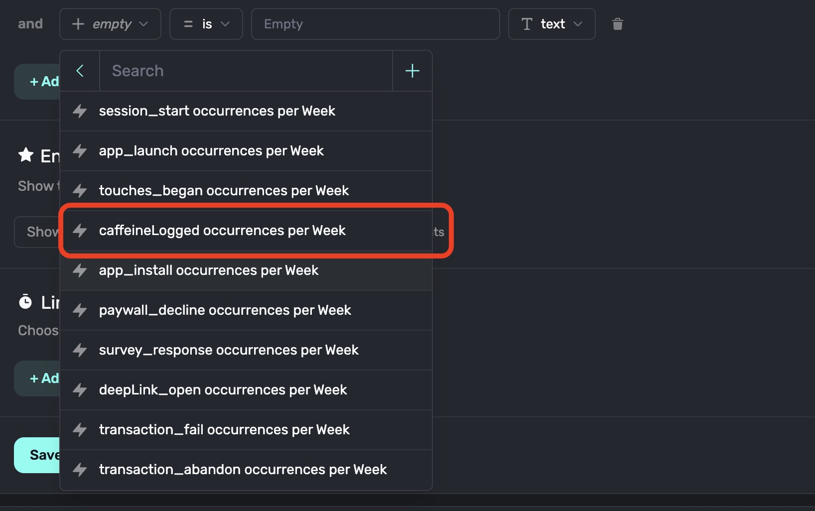 Then choose the operator you want to use and the number of times the event or placement must have occurred. In our example above, we're targeting users who have logged caffeine at least 5 times in the last week. Be sure to click the Save button to save it: