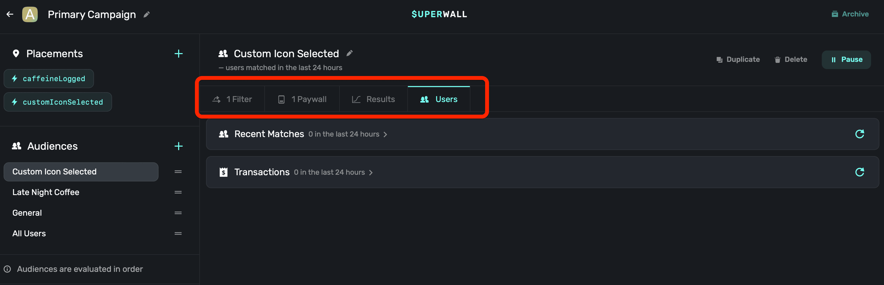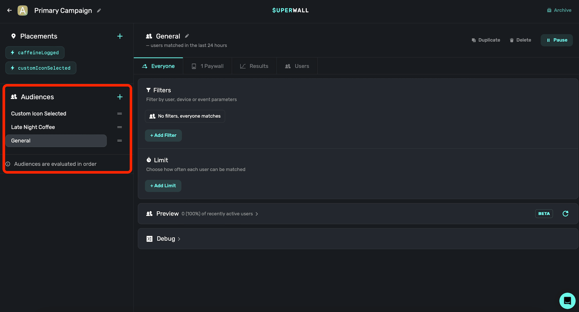 If a user logged caffeine in the morning, Superwall would first check if they matched the custom app icon audience, and then the audience for logging caffeine late at night. Since neither of those match (since they are logging caffeine in the morning, and not setting a custom icon), they'd land in the "everyone else" audience bucket.