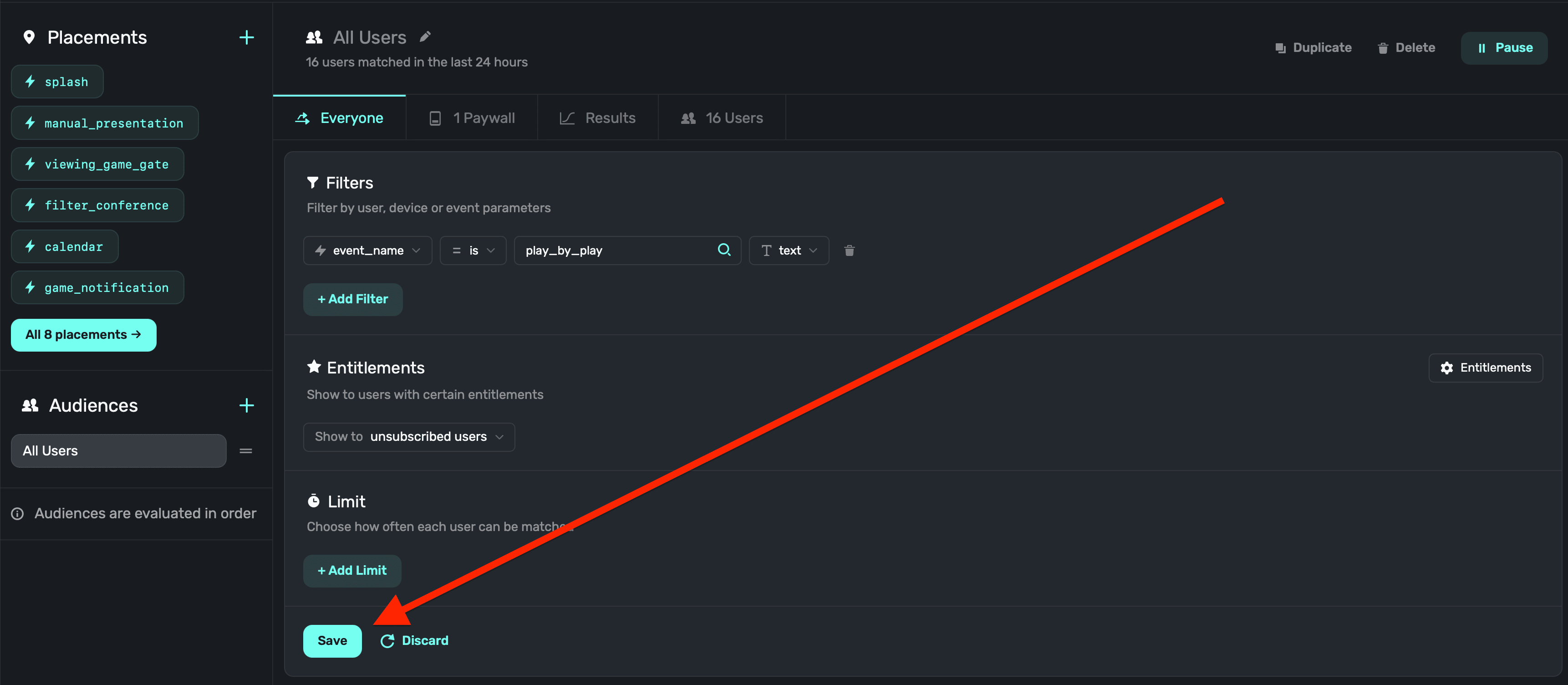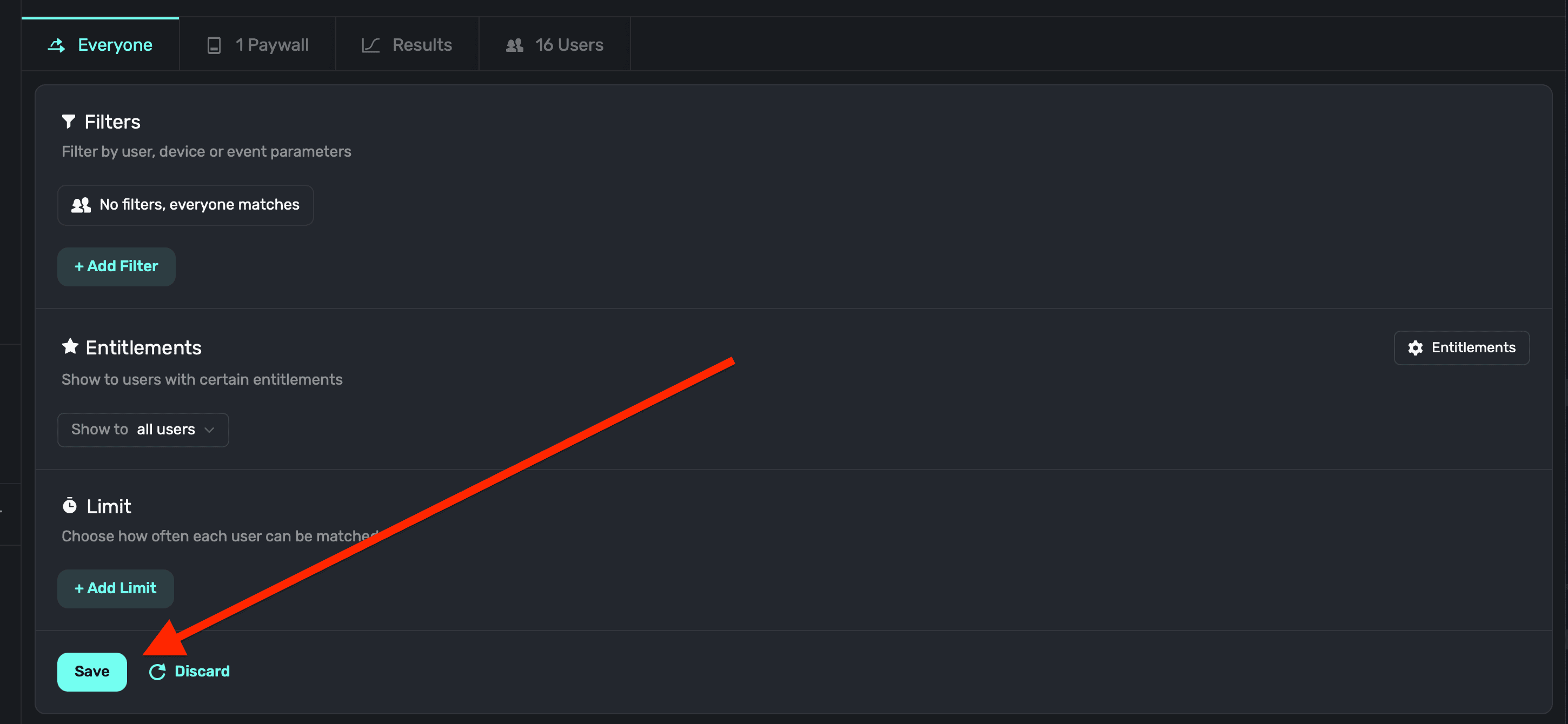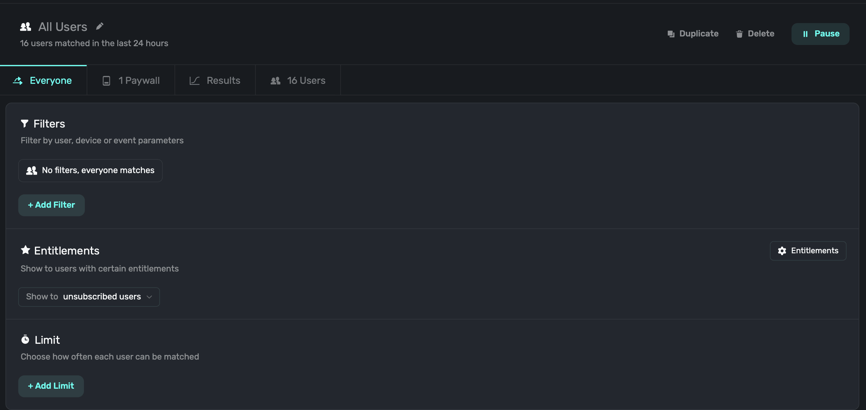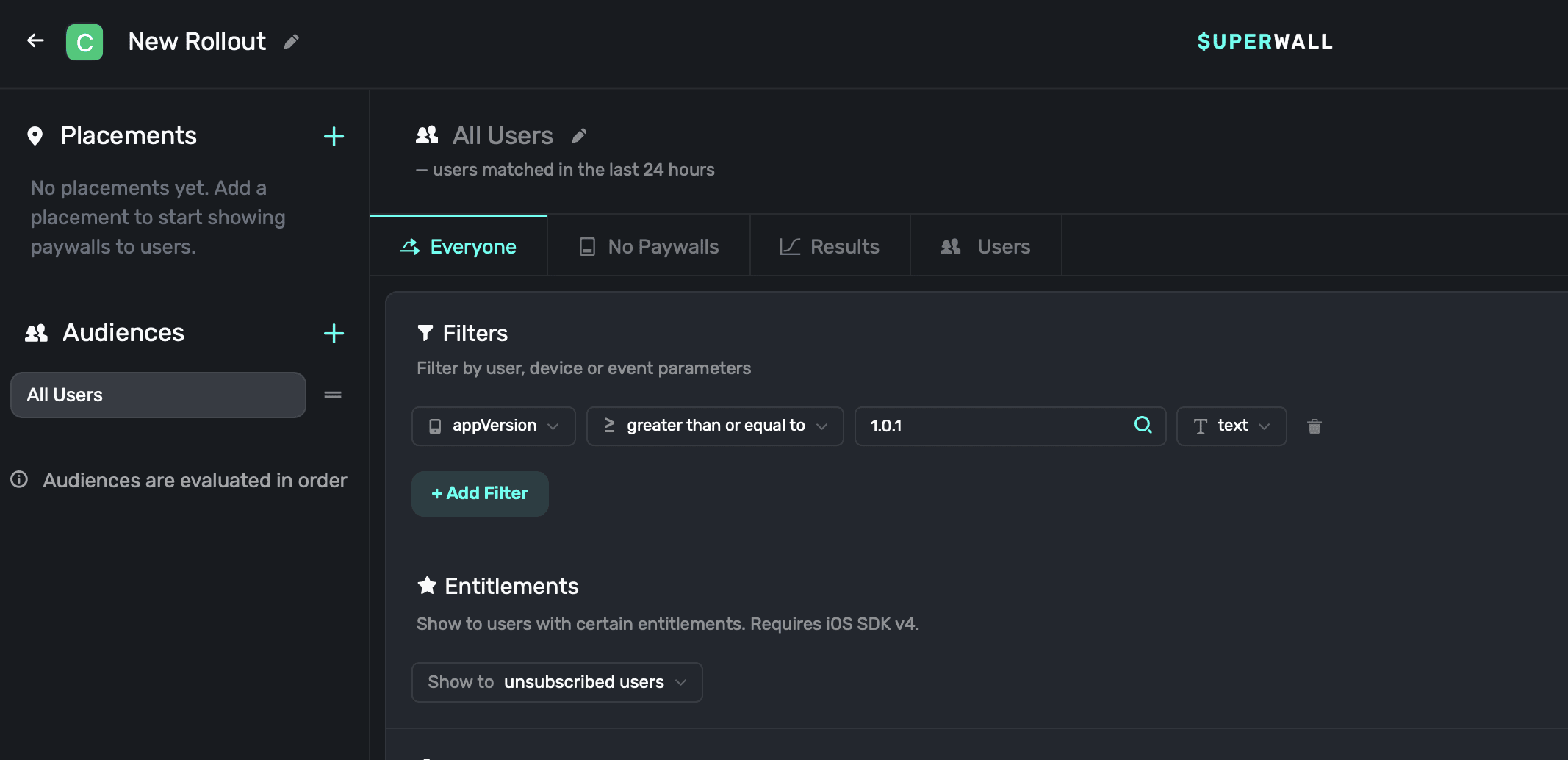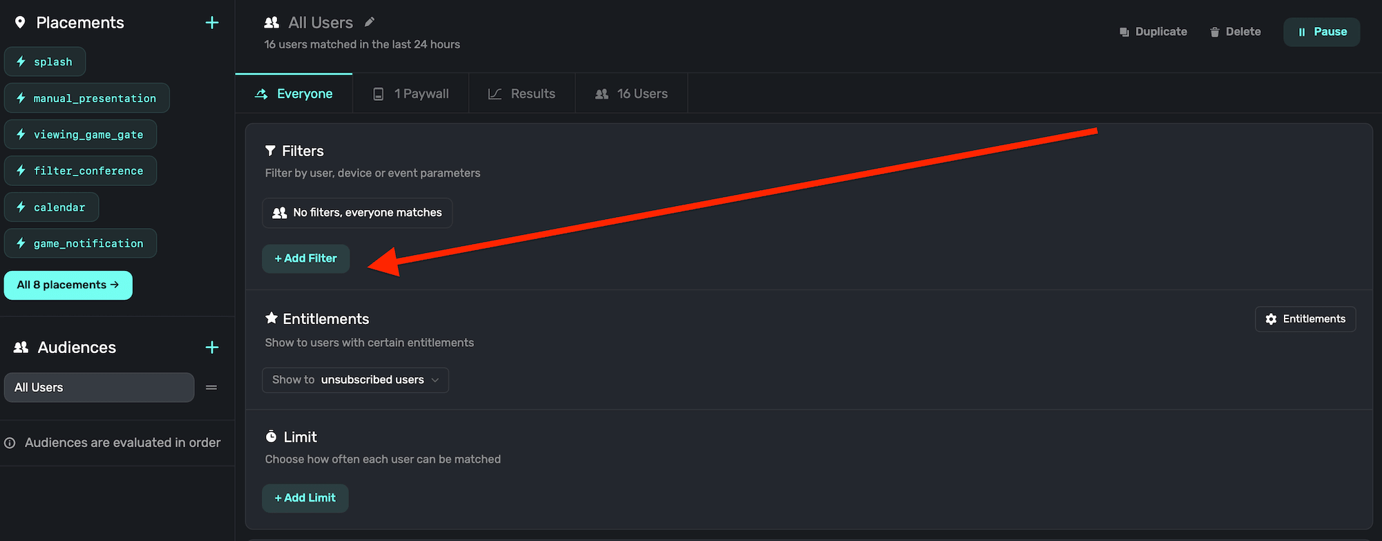If creating filters to show a paywall under certain conditions doesn't apply to you, then you can simply leave the default audience on — it'll match everyone who hits a placement.