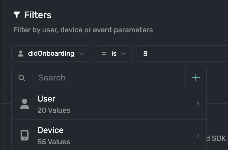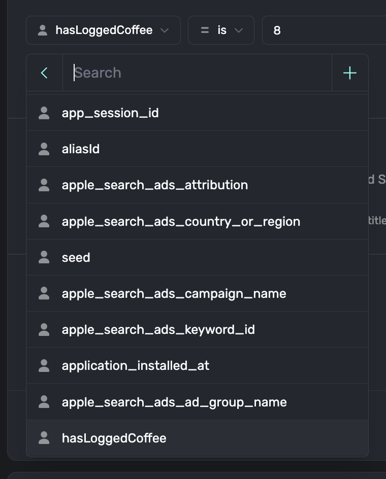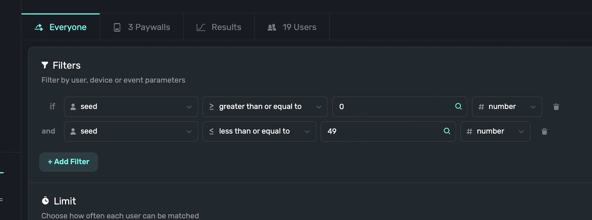 One particularly useful property to filter by are user seeds, which are automatically assigned by Superwall to a user from 0-99. You can add them as a filter by entering user.seed. User seeds are primarily used to control entirely different user experiences across different campaigns.