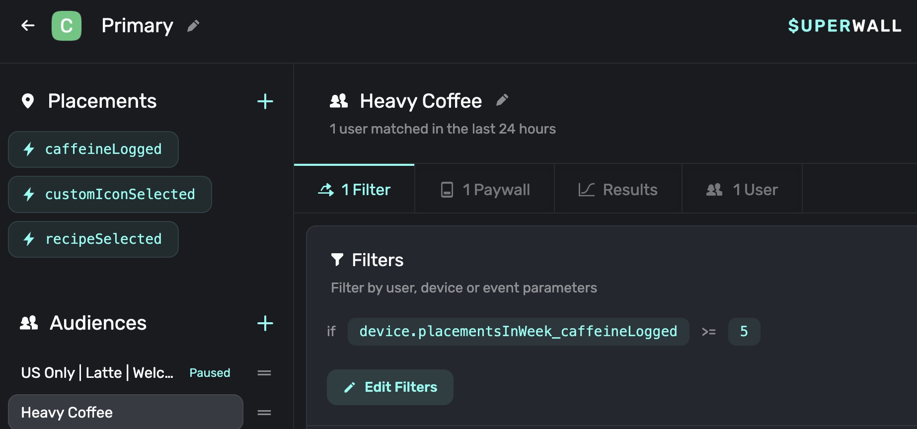 From there, Superwall will generate a filter for you. You can then click the Save button to apply it: