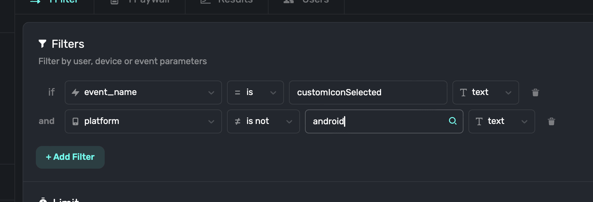 You can combine rules together, too. In the following example, if we only wanted the paywall to show on iOS, and not Android, you can simply click "+Add Filter" once more, and add the condition: