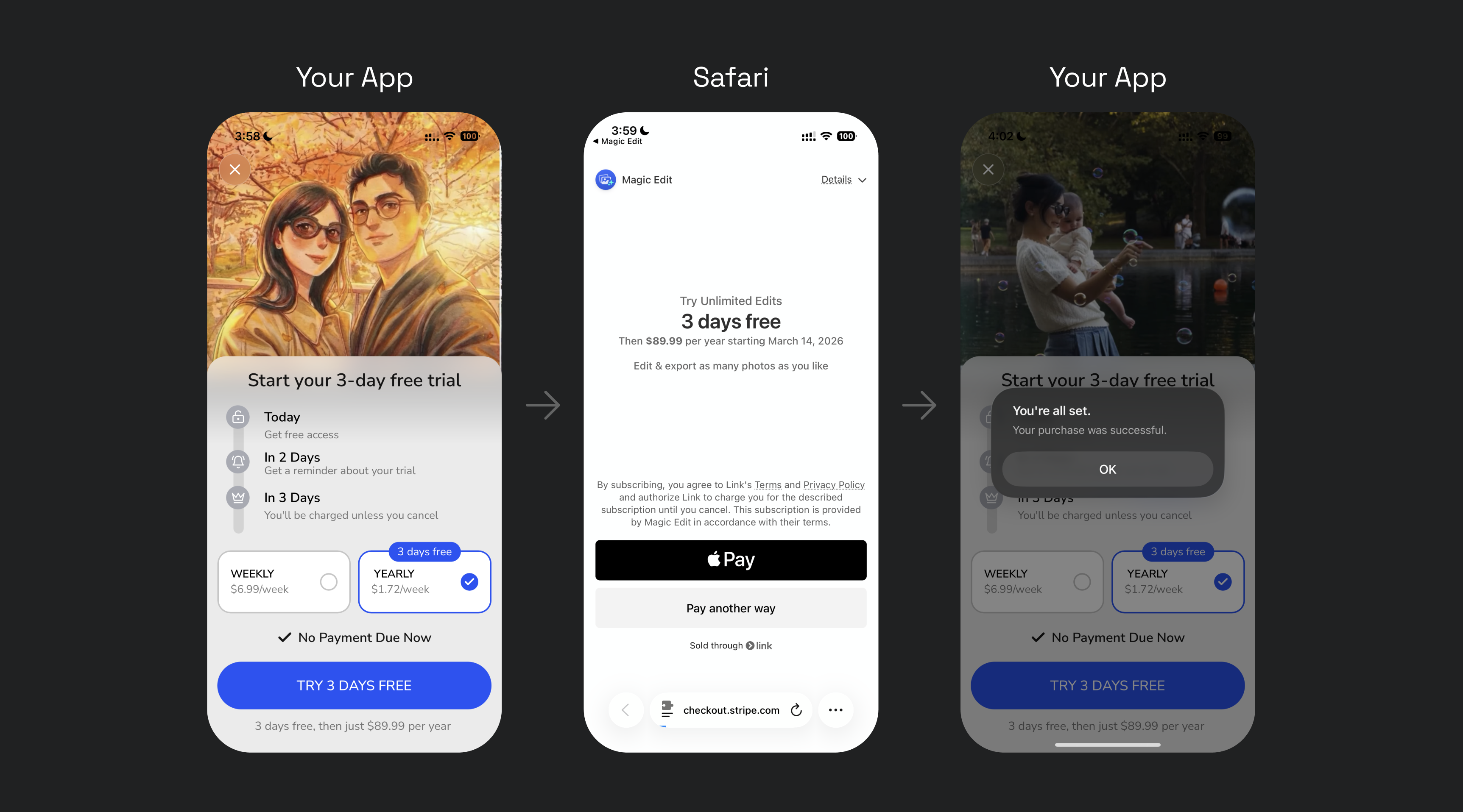 App Store Review Tip: If you're using an in-app Stripe checkout sheet, we strongly suggest showing your Stripe purchase experience to Apple during an App Review before testing with users. For recommended reviewer note language, see the App2Web docs.